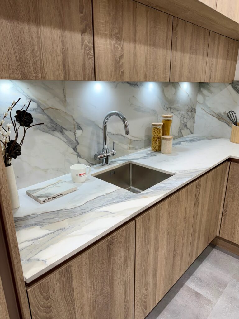 To achieve a seamless kitchen design, it helps to treat the worktop as your anchor point. Begin by selecting a surface that reflects your vision, whether that’s a clean, bright quartz for a minimalist space, a textured porcelain for something more industrial, a rich granite for bold character, or a soft marble for timeless charm.