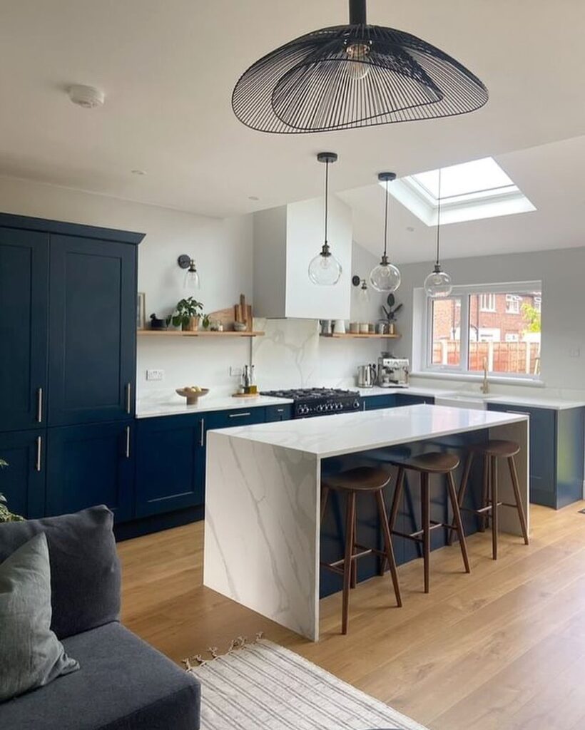 Cabinetry and worktops are two of the most dominant visual elements in any kitchen, so pairing them well is essential for a great result. Start by deciding whether you want contrast or coordination. For example, a light quartz worktop with fine veining pairs great with deep-toned cabinets such as navy, forest green or matt black, which gives off a dramatic but balanced effect.